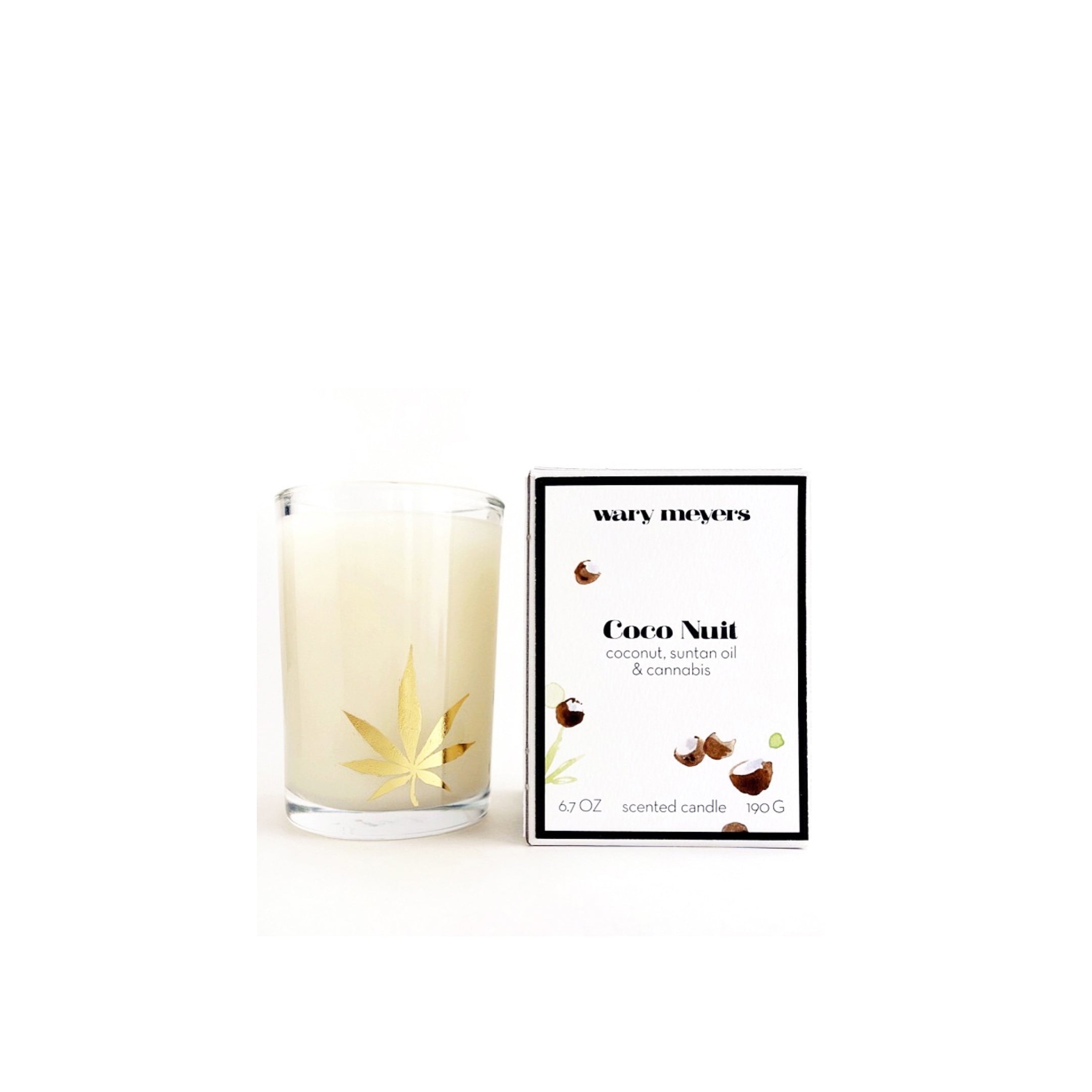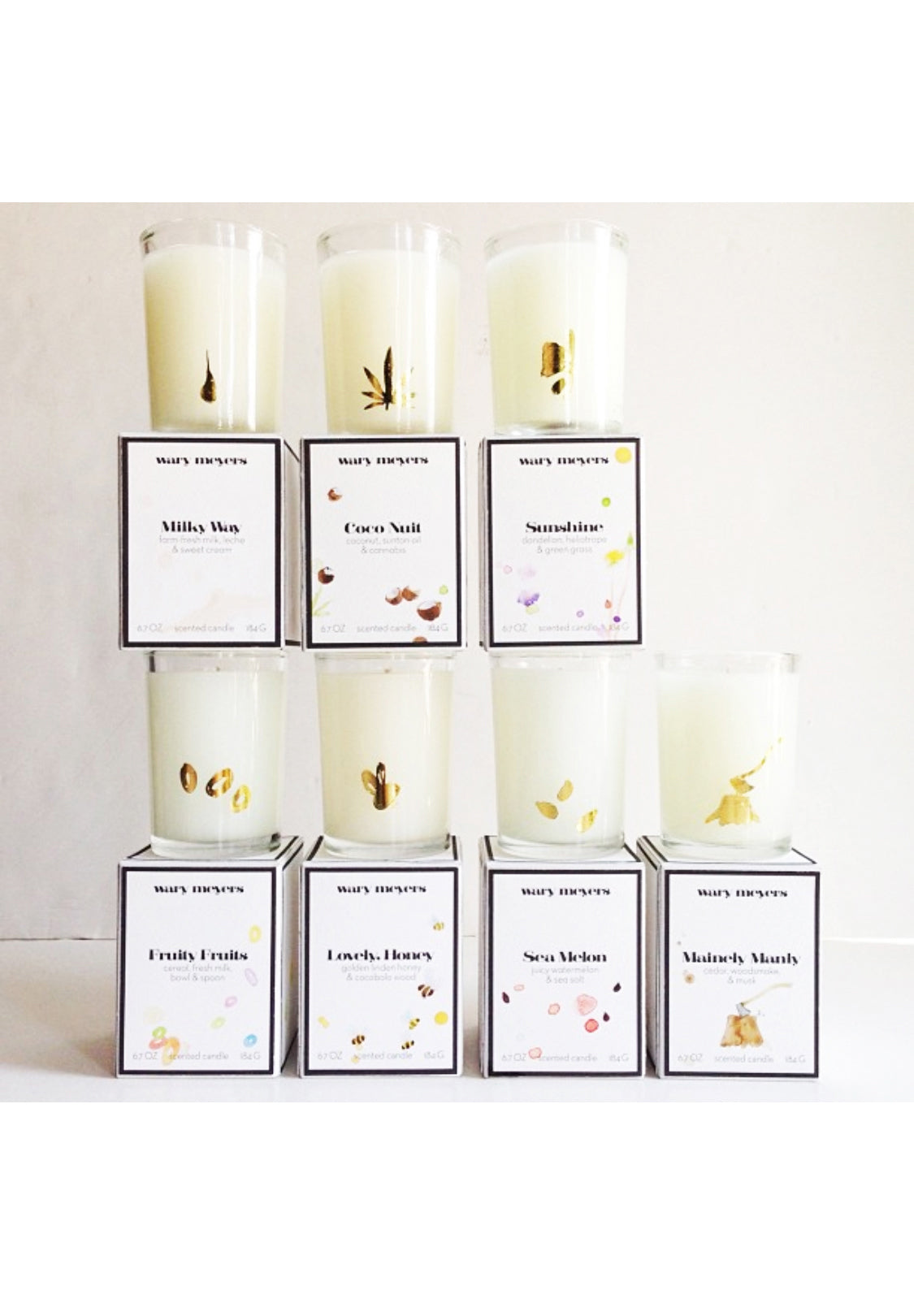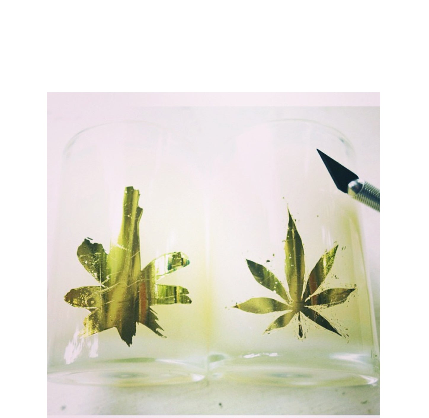 John hand stenciled each design in gold leaf on the glass, no design was the same! We printed the box panels on watercolor paper, cut them out and glued them onto the sides of a box to complete the transformation. The scents mixed by us, the candles made in our kitchen.