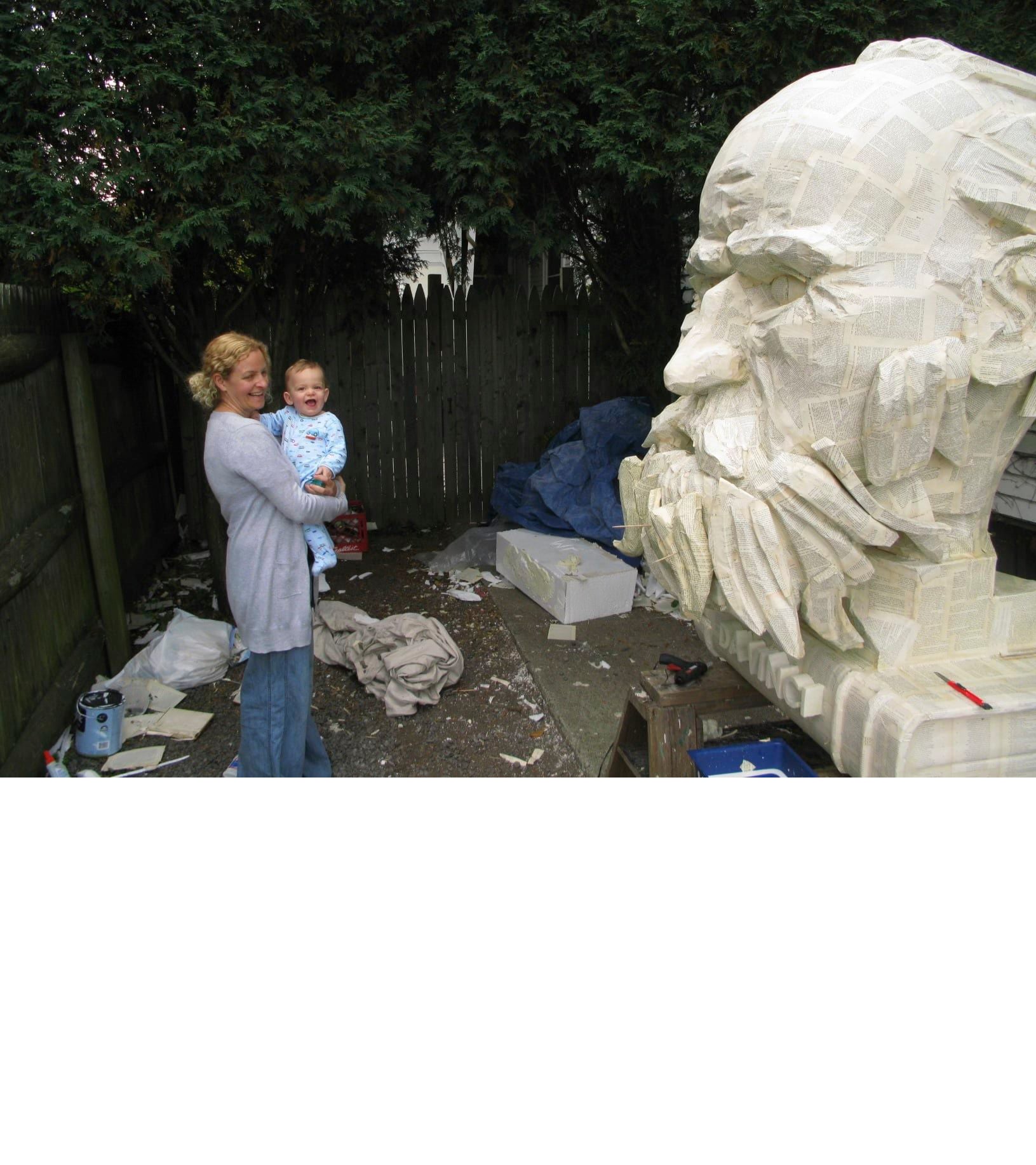 We sculpted two towering 5-foot busts of Leonardo da Vinci and William Shakespeare, carved from styrofoam and meticulously paper-mâchéd with pages from old books—an ode to the building’s former life as a library. Arts and letters icons, reimagined as striking, story-filled sculptures.