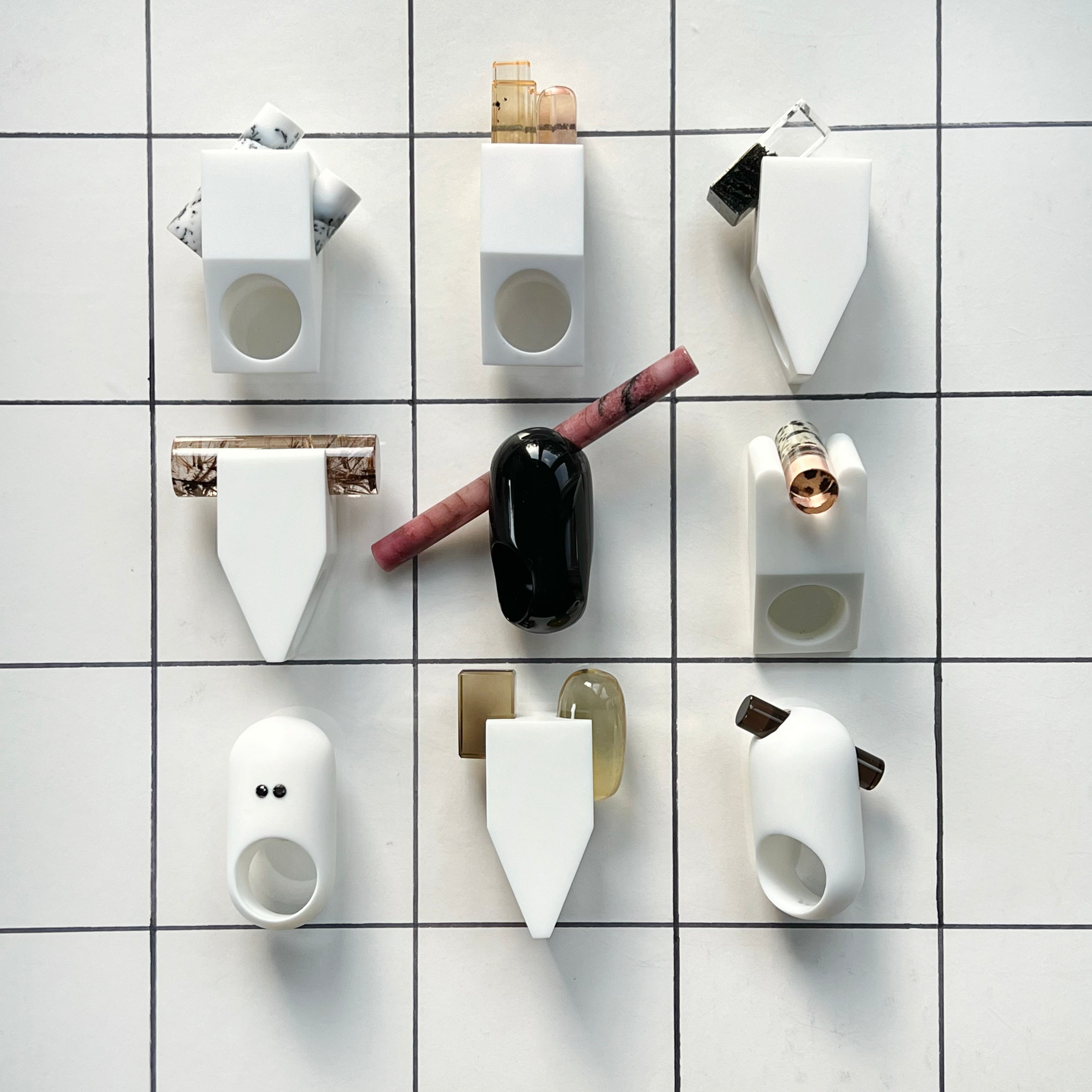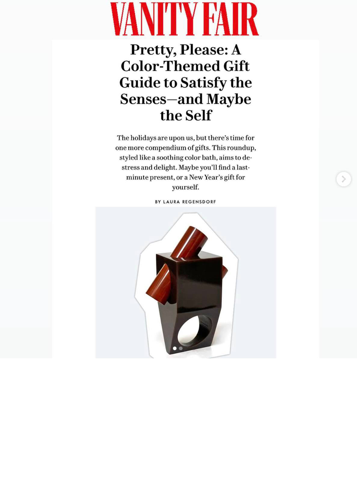 Linda’s side gig (and obsession) is making and collecting jewelry, pictured in Vanity Fair’s gift guide is The Tree Ring, a resin 3D printed & polished modernist cocktail ring set with an agate cylinder.