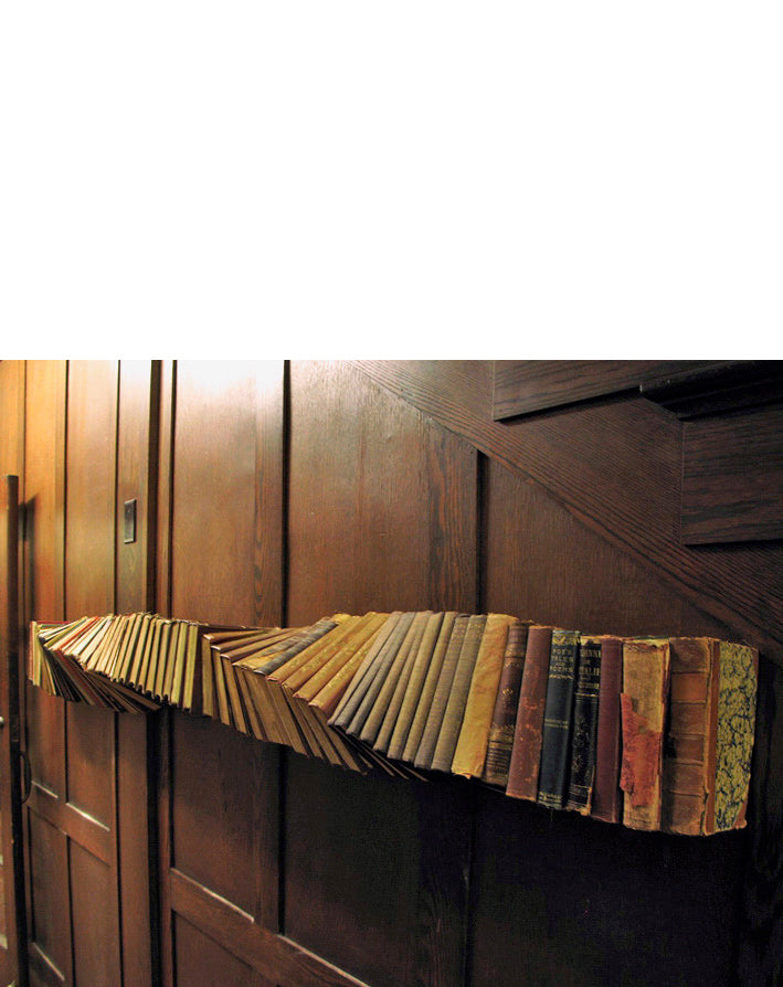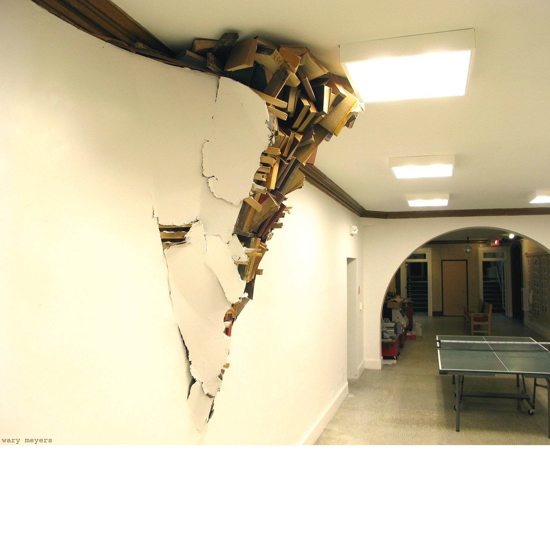 ( installations of books exploding through the basement wall, and “twisted tales” on the entryway walls.