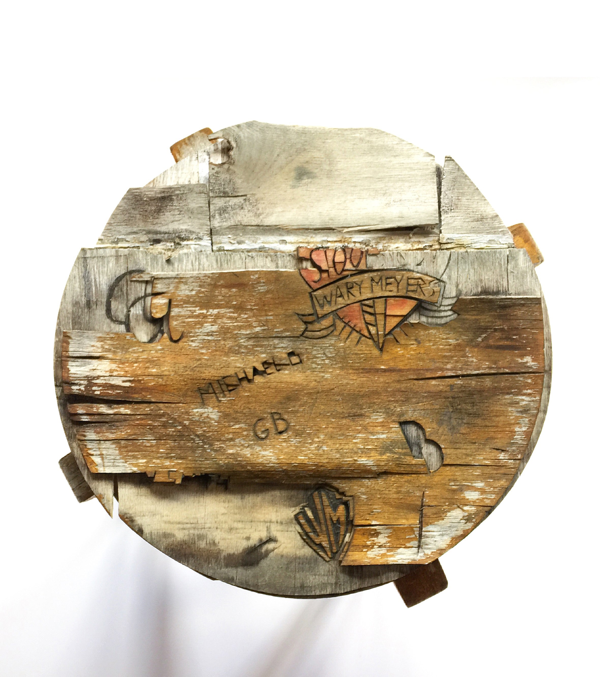 A stool becomes even more visually arresting after years of being left outside in the Maine elements