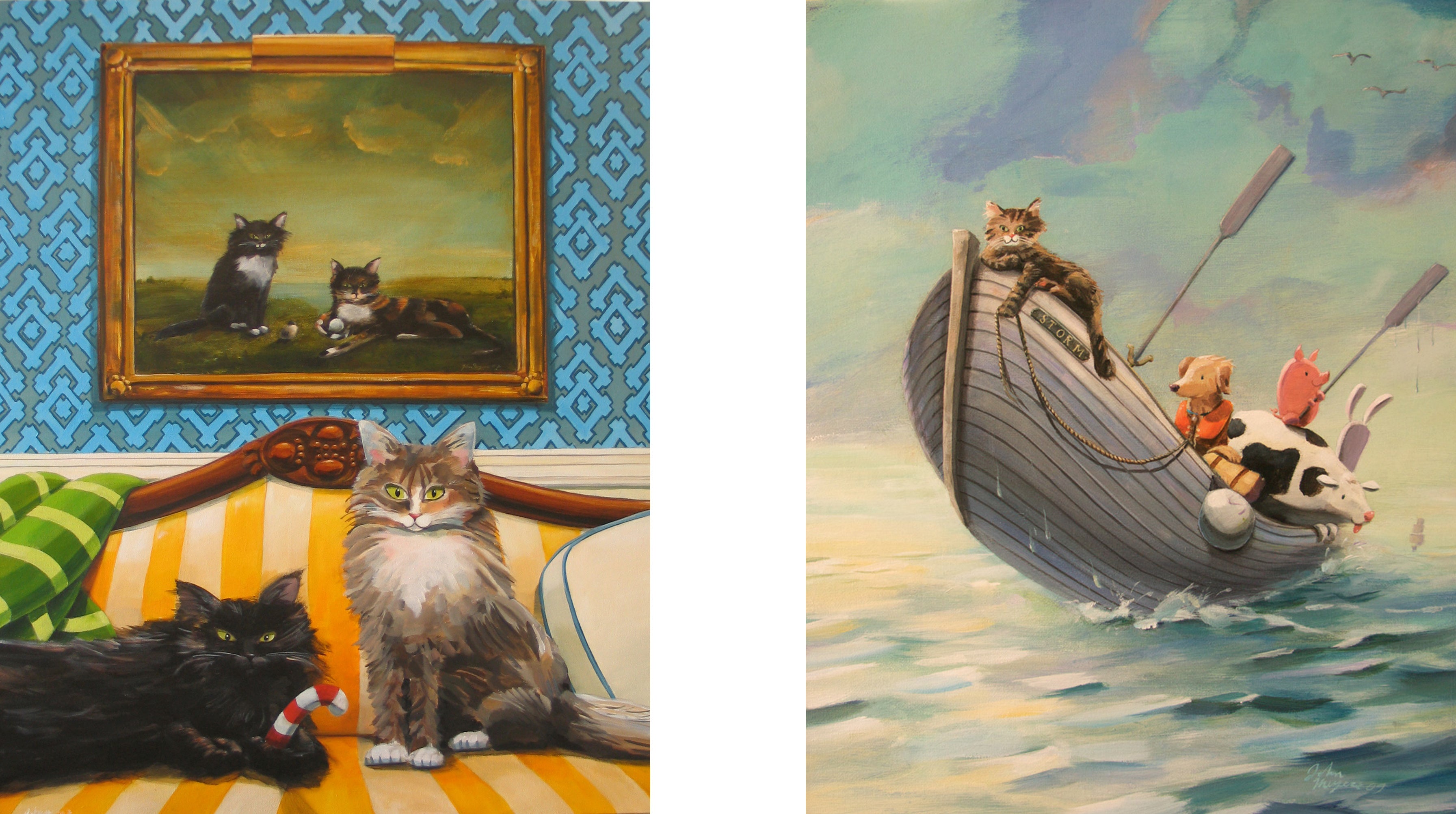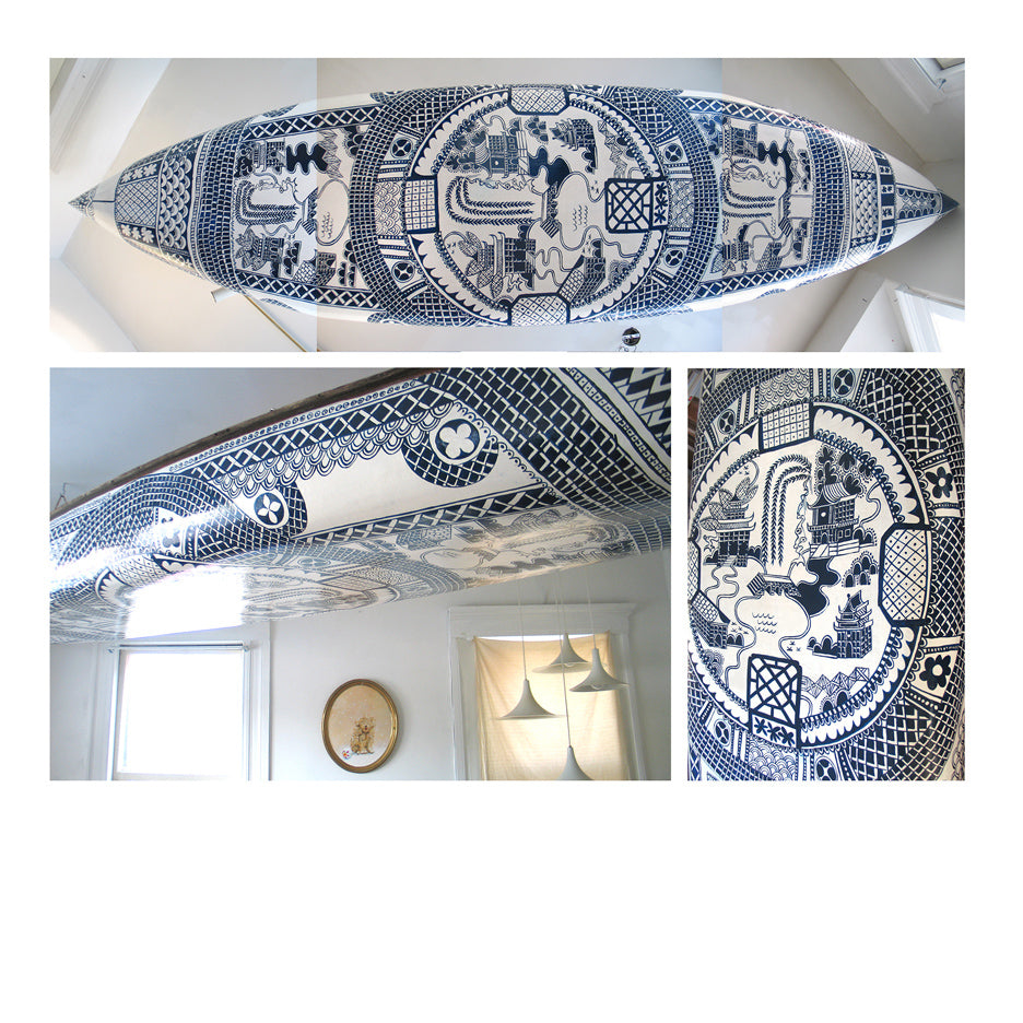 We found this canoe on the side of the road and John decided to paint a blue willow motif on it. It then made it into the Portland Museum of Art Biennial. In maine you find a lot of sea glass, and old pottery shards washed up on the beach. The idea here is what if those shards were not from pottery being thrown in the water but pieces of the boats themselves. RIGHT: examples of John’s paintings