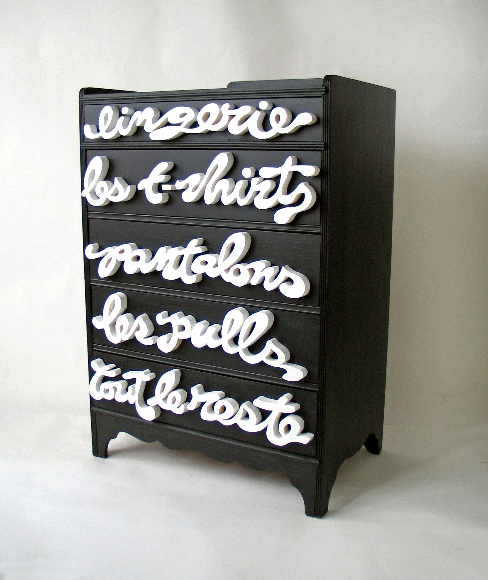 Le French Dresser, another type-driven project with wooden hand cut drawer pulls to spell out the treasures inside.