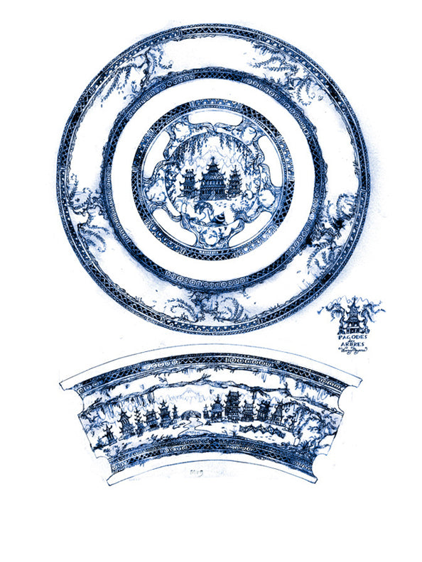 A tableware manufacturer approached us to design some dinnerware. We came up with a stylized blue willow /flow blue pattern called “Pagodes des Arbres”. Unfortunately this was deemed too esoteric for the mainstream plate buying market but we love it anyway. Pictured are the dinner plate and the mug, John also drew a salad plate, soup bowl, tea cup, and saucer. None of the drawings were copied-and-pasted for the different patterns.