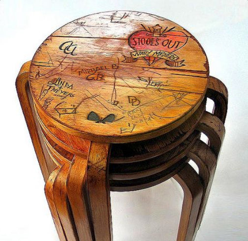 We carved our own version of Alice Cooper's “School's Out” album cover into some copies of Alvar Aalto stools then added a distressed Finnish. Very punny all around. These were part of our fortnitely Time Out New York column on repurposing.