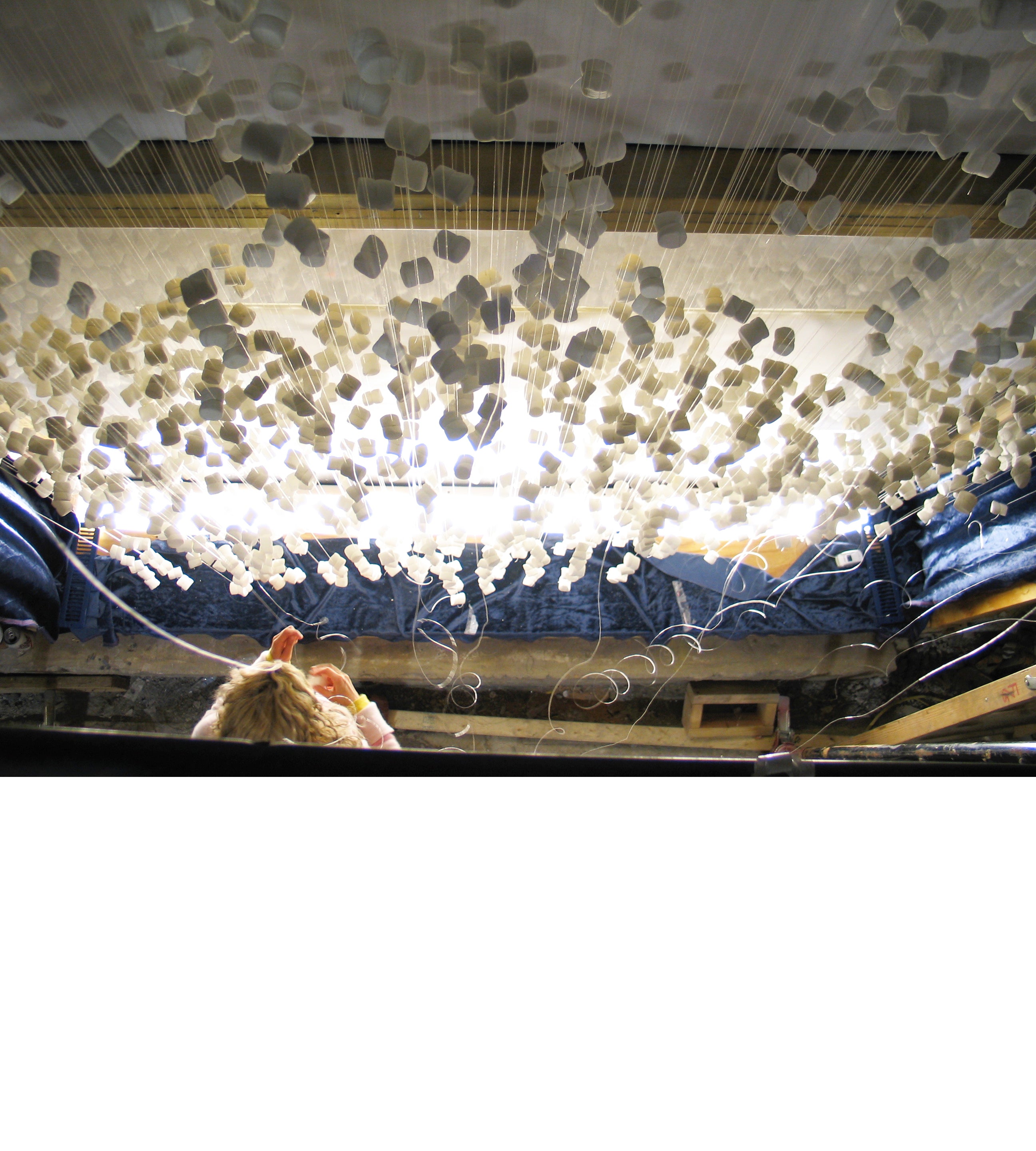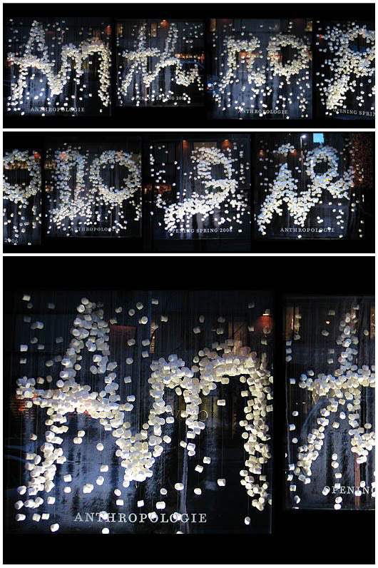 The holiday windows for the grand opening of Anthropologie, Rockefeller Center. The two of us designed then strung thousands upon thousands (upon thousands) of marshmallows that spelled out Anthropologie in an unheated space after hours. The idea was to make it resemble a giant snowglobe. We had ventilation installed above the lines of marshmallows, which made them all gently flutter. The effect was pretty magical.