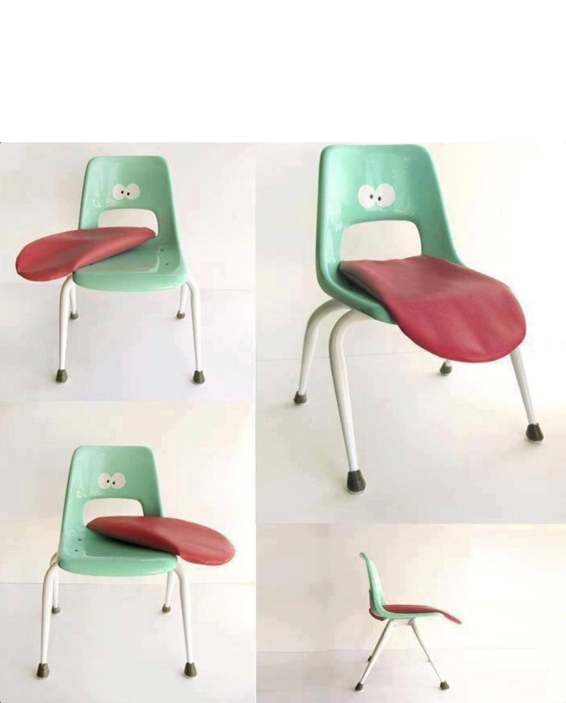 Our "Tongue Chair" made from a discarded school chair that we repainted in high gloss turquoise with a vinyl pink tongue.