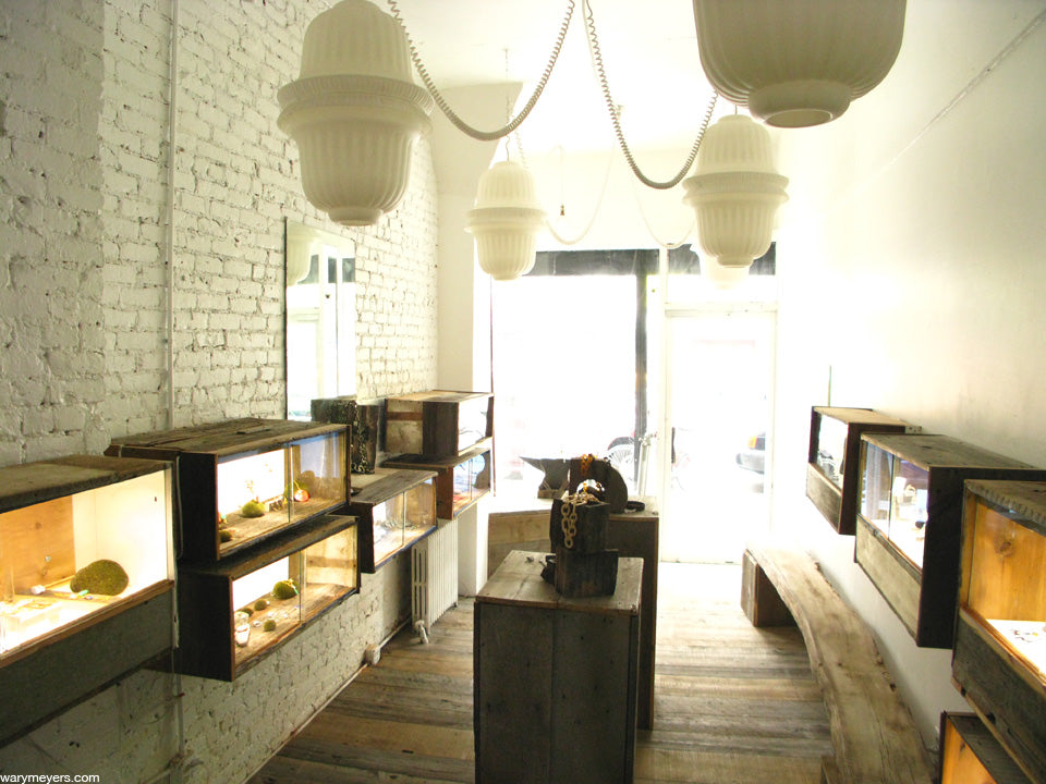Lisa Linhardt Jewelry store design, East Village, NYC. We created everything in this shop, made mostly from old Maine barn wood. The lighted, locking cases, the floor, the display stands, the counter, the door handle, the bench, etc. The hanging lights were made by screwing two plastic urn planters together and wiring them with retractile cord.